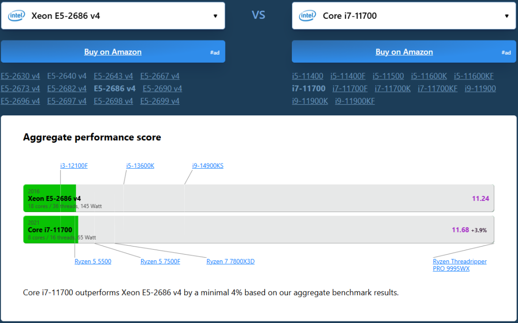 - Hiệu năng CPU Intel Xeon 2686V4 ngang với Core i7 11th, nhưng giá lại rẻ hơn rất nhiều