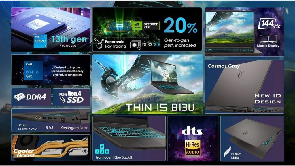 Kết hợp cùng card đồ họa rời NVIDIA GeForce RTX 3050 4GB GDDR6, MSI Gaming Thin 15 B13UC mang lại hiệu năng đồ họa vượt trội, tái tạo hình ảnh chân thực, hỗ trợ công nghệ Ray Tracing và DLSS cho trải nghiệm chơi game và sáng tạo nội dung mượt mà, sắc nét.